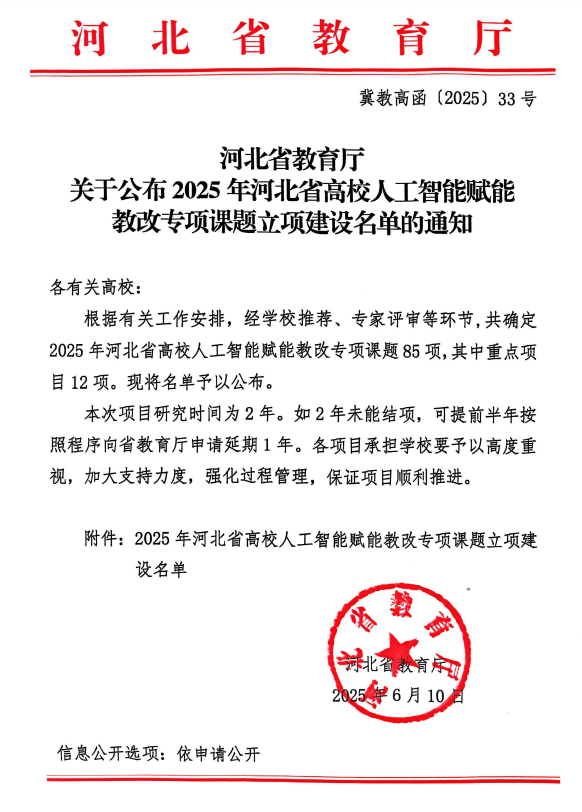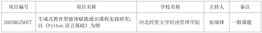 日前,河北省教育厅发布了《河北省教育厅关于公布2025年河北省高校人工智能赋能教改专项课题立项建设名单的通知》(冀教高函〔2025〕33号),动漫屋 张瑞锋老师申报的课题《生成式教育智能体赋能通识课程实践研究:以《Python语言基础》为例》获批立项。