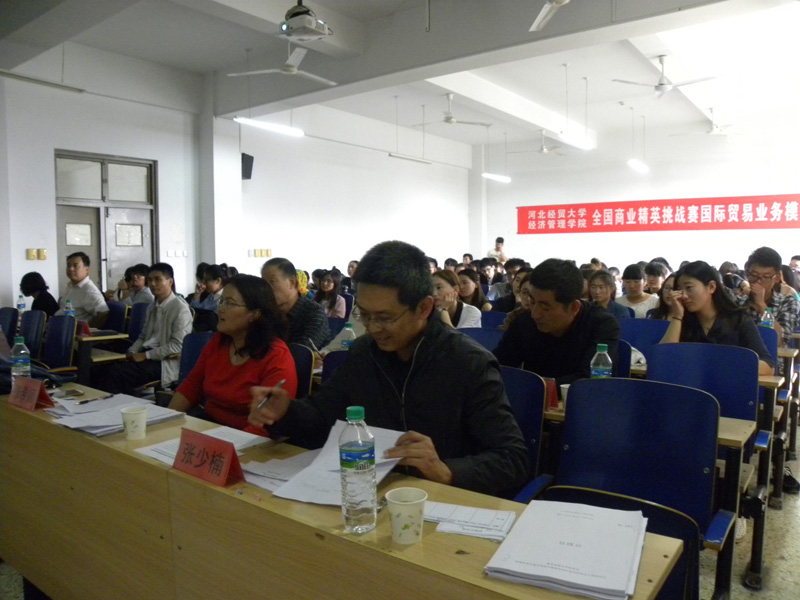 4月28日下午,由学院实践教学部组织、商务系承办的全国商业精英挑战赛国际贸易业务模拟竞赛校选赛在北校区第三教学楼402举行,国贸专业五支代表队参赛。河北华威凯德照明科技股份有限公司副总渠卫军、市场部总监李霞,学院实践教学部部长张凤海、商务系书记廖俊峰、系主任张学引以及相关专业班级辅导员和学生代表200名学生观摩大赛。比赛还得到商学院和国际教育学院的大力支持,特邀国际教育学院副院长张希颖和商学院刘晓鸾、张少楠、杨柳婧教授担任评委。