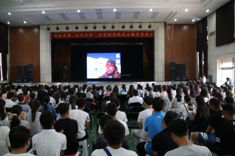 1982级金融专业优秀校友、中国登山界代表人物、国家体育运动荣誉奖章获得者、探险家张梁“行走在世界之巅——超越梦想 永不止步”主题分享会在学院礼堂隆重举行。学院党委副书记刘会娟、各系党总支书记、学工部相关人员、辅导员代表,以及七百多名同学聆听分享会。活动由学院党委书记张进良主持。