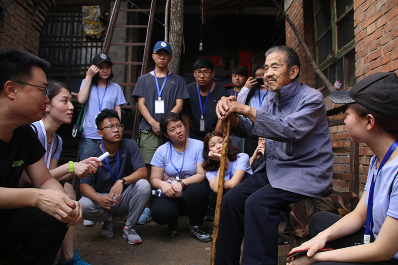 小分队在东回舍镇书记的带领下,首先来到90岁的李竟成老人家,这里庭院宽敞,干净整洁,学生们围坐在老人身旁,听他讲述当年的抗战经历。李竟成17岁入伍后被分配到晋察冀第四军分区兵工厂做后勤补给工作。为防止日军和国民党破坏,兵工厂曾数次搬迁,辗转多地,李竟成一直跟随。抗美援朝战争打响后,李竟成接受军需部命令,带领全班40余名战士仅用三天的时间就赶制完成了40万双军鞋的任务,实践小分队的同学们听了无不惊讶,要知道那时机械化并没有普及。离开老人家的时候,李竟成一直用军礼目送,他对党对国家的忠诚之举震撼了在场的每一位学生。