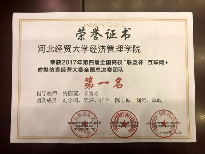 2015级物流管理1班的柴深、单政、张宇、刘涛,2015级物流管理2班的刘宇桐和2015级工商管理1班的陈志诚在指导老师贺丽蕊和李雪松的带领下,认真准备,沉着应战,最终获得了全国总决赛一等奖的优异成绩,为动漫屋