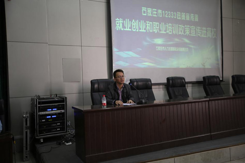图书馆广场和报告厅举行。石家庄市人力资源和社会保障局党组成员、石家庄市就业服务中心主任孟运苍、市人力资源和社会保障局副调研员刘向前、学院院长刘华光、学院党委副书记张丽英出席了活动,市就业服务中心副主任纪学宏主持,市人社局相关部门负责人及300余名学生聆听了报告。
