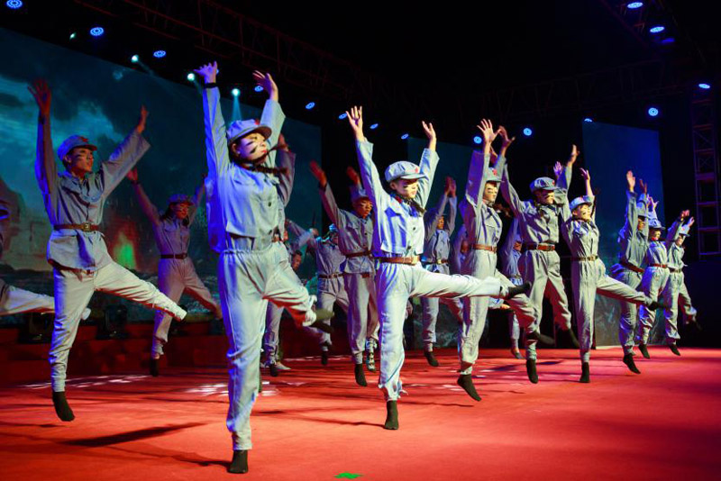 晚会以“忆红色经典 燃星光之夜”为主题,共分三个篇章:第一篇章《旭日初升鲲鹏展翅》以一曲《新长征路上的摇滚》震撼开场,舞蹈《我的长征》再现了战士们用钢铁般的意志铸就新中国坚固城墙的史实,艺术学院老师用一曲优美的《阳光路上》歌颂在党的正确领导下祖国一步步走向繁荣富强的伟大成就;第二篇章《改革开放实干兴邦》以诗朗诵、歌伴舞、竹笛合奏、小品的形式从不同角度细数了改革开放四十年,我们的生活和观念发生的翻天覆地的变化,站在新时代的潮头,青年学子们勇敢发出了嘹亮的呐喊:“看未来由你我书写!”见证着思想解放的小品更是赢得了观众的阵阵掌声;第三篇章《不忘初心牢记使命》以歌伴舞《中国梦》开篇,唱出了新时代中国人的向着梦想坚定前行的决心;诙谐幽默的相声《我的青春 我的党》在欢笑中紧扣时代主题;古典舞《丝路绽放》将中国古典音乐与汉唐之美完美诠释,展现“驼铃古道丝绸路,胡马尤闻唐汉风”的绝美意境,学院退伍军人和国旗护卫队带来的《军枪操》气势威武,震撼全场。