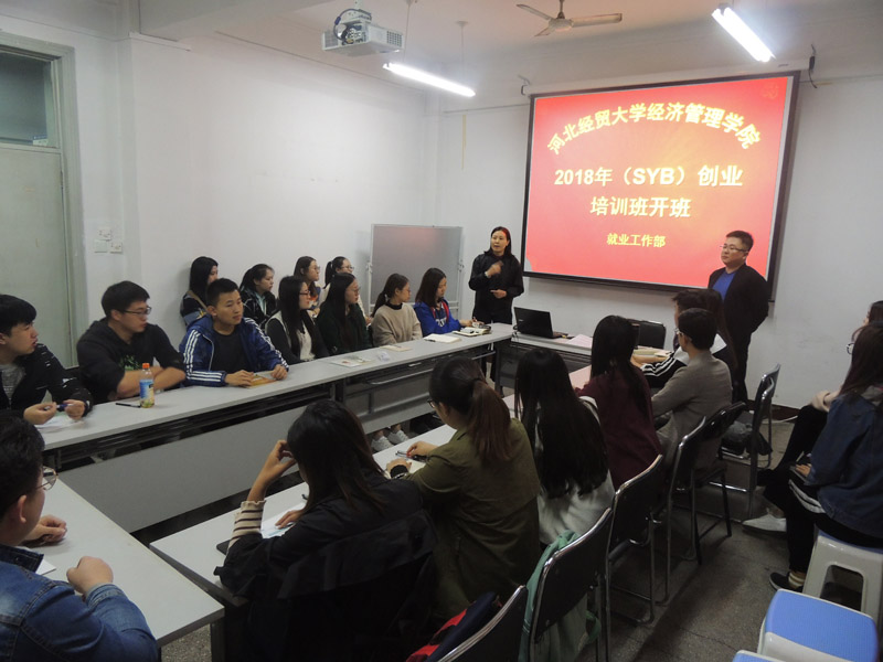 2018年(SYB)创业培训班开班。就业工作部聘请石家庄市桥西区就业服务局孙嘉骏、相会娥两位创业指导专家对报名的62名大四学员进行为期10天的培训。仪式由就业工作部副部长胡党育主持,就业部相关人员和全体学员参加。