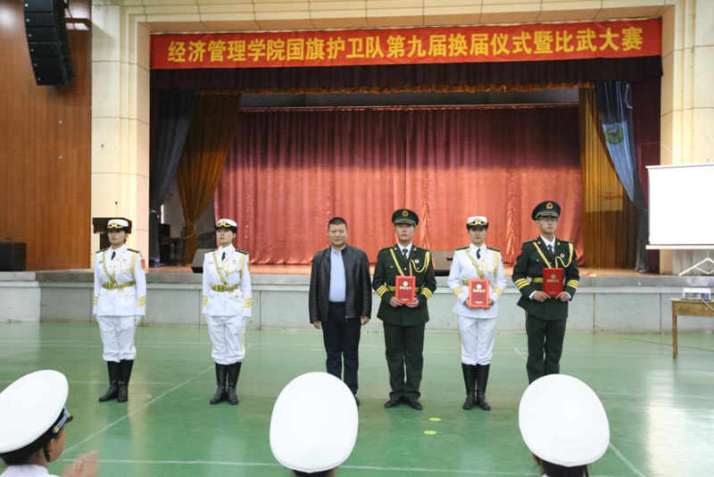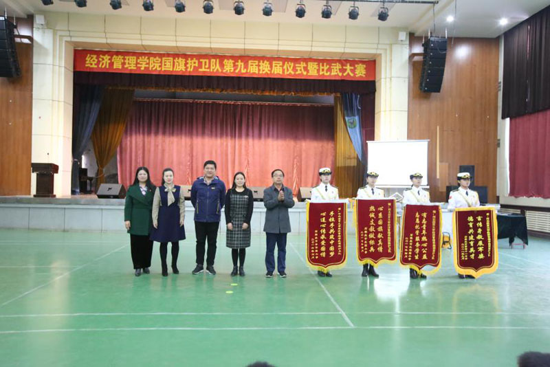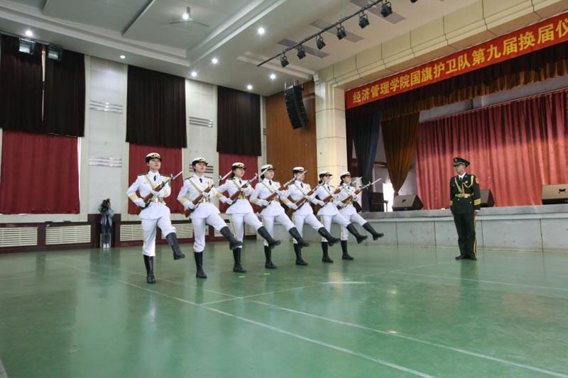 国旗护卫队第九届换届仪式暨比武大赛在经管礼堂拉开帷幕。河北省教育厅德育研究中心副主任蔡杭州莅临大赛现场并讲话,学院党委副书记张丽英致欢迎辞,国旗护卫队队员以及200余名学生代表参加了活动。石家庄庄园小学40余名小学生应邀观摩了比赛并做才艺展示。