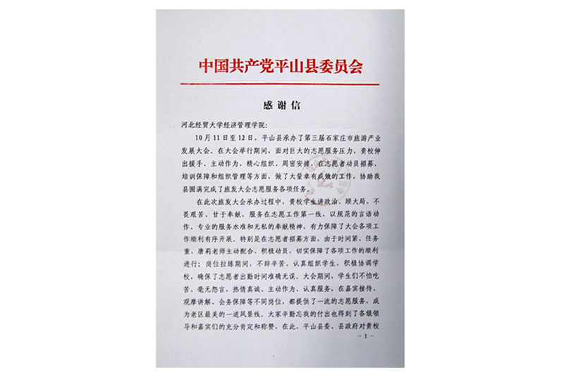 志愿者在石家庄市第三届旅游发展大会中给予的支持和帮助表示感谢,同时将平山县委县政府的一封感谢信送到院党委书记张进良手中。
