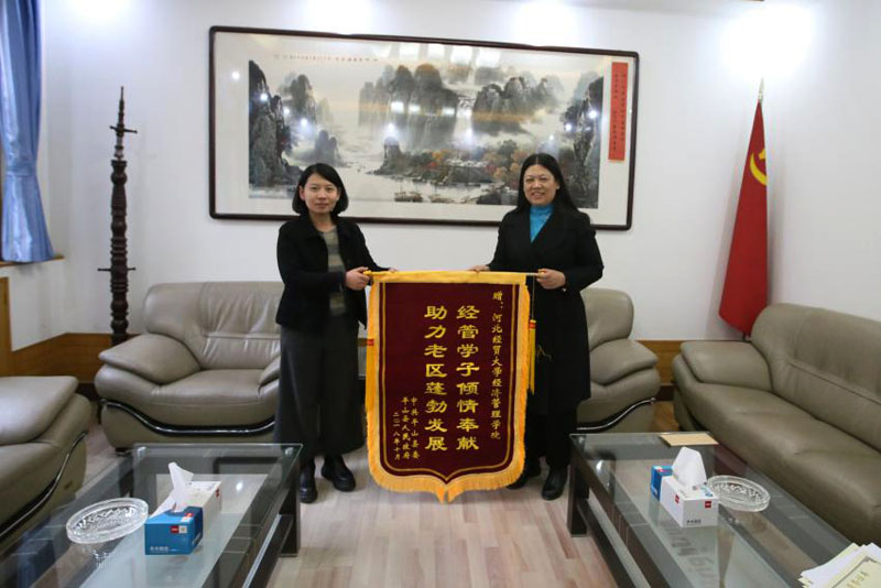 11月13日下午,平山县团委副书记王秋静代表平山县团委将一面“经管学子倾情奉献助力老区蓬勃发展”的锦旗送到学院党委副书记张丽英手中,对10月中旬动漫屋