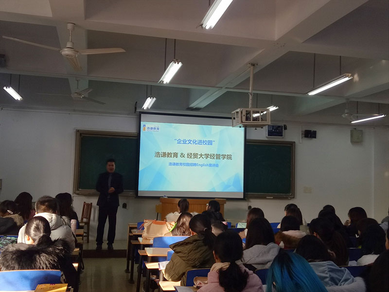 浩谦教育小学部董部长用浩谦教育老师们自制的VCR和内涵丰富的浩谦故事,向同学们介绍了企业概况、员工团队、英语特色、价值观等相关动漫屋;以切身经历解读了浩谦“六个一”的文化理念,董部长还从企业招纳贤才的角度告诉同学们英语专业发展前景与择业方向、职业生涯规划、面试技巧等内容,同学们受益匪浅。
