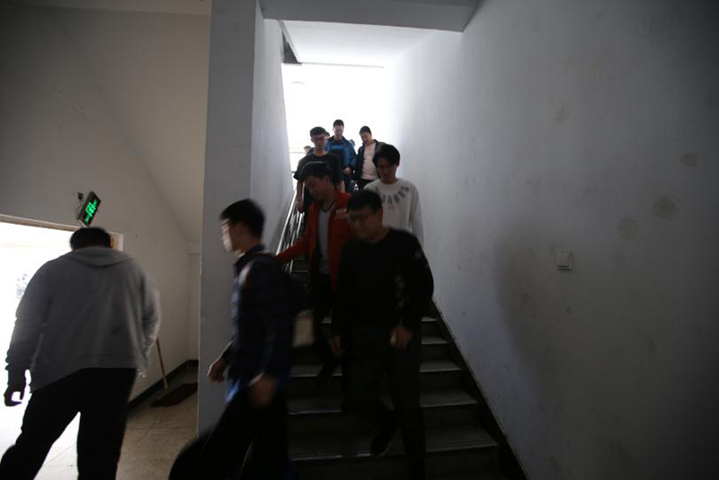 演练开始前,路士国首先简要介绍了演练流程和注意事项。14点50分逃生演练正式开始,公寓楼哨声鸣响,根据演练方案组成的各个应急小组迅速进入工作状态,组织开展楼内学生进行疏散逃生。楼层引导员在紧急出口为疏散人群指引方向,并逐一检查每间公寓,确保所有学生按要求撤离;楼道口安保人员提醒学生以正确的姿势迅速逃生到指定位置;校医院医护人员提着急救箱氧气袋随时待命;各班辅导员在集合地点核实学生人数……在各小组的密切配合下,楼内800多名学生安全迅速有序地从1号公寓撤离,整个疏散逃生仅用时4分钟。