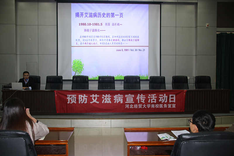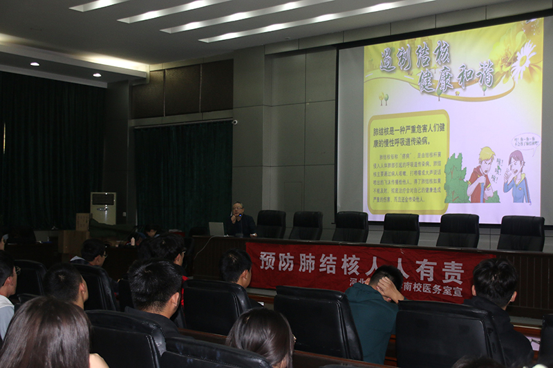 南校区校医院主办的肺结核病、艾滋病防治科普知识讲座在图书馆报告厅举行。讲座特邀石家庄市第五医院结核病科主任王海宾、感染科付立哲主讲,由校医院副院长陈娟主持,300余名大一新生到场聆听。