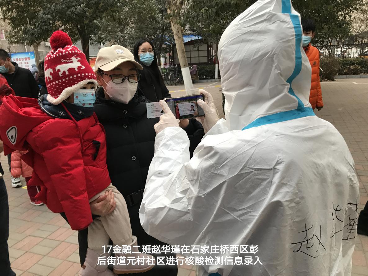 17级金融二班赵华瑾所在的小区——石家庄桥西区彭后街道元村社区是一个超过8000人的大社区,组织这么多人的核酸检测,光是信息录入就相当繁杂,赵华瑾主动报名,协助居委会完成三次核酸检测及录入,日常还帮助居民买电、买药、买菜,即使经常冒着寒风骑车出去,她也从不抱怨,听到大家一声“辛苦了,谢谢!”,心里就颇有成就感。