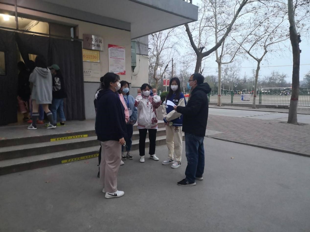 封闭期间,学生的吃住学都在宿舍进行,宿舍卫生和安全不容忽视。陈江伟老师勇挑重担,组织学生会对全部宿舍卫生进行检查,对使用违禁电器等安全隐患进行精细排查,确保安全隐患“一个都不能有”,组织学生志愿者积极配合学院的各项工作。年近58岁的孙文先老师主动报名留守校园,和西校区综合办一起监督检查食堂卫生。
