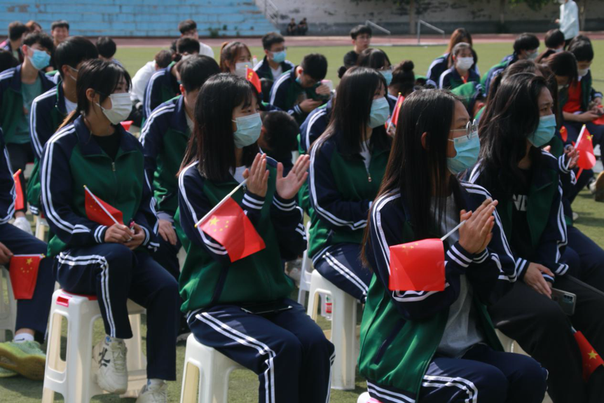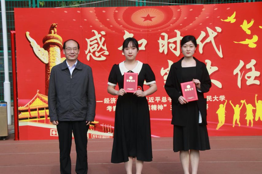 “我和我的祖国,一刻也不能分割,无论我走到哪里,都流出一首赞歌……”9位选手刚讲完,由经济系党总支书记和副书记蔡杨、郑庆国领唱的《我和我的祖国》的歌声就在操场上响起,大家站起身,挥舞着手中的国旗,一起高唱对祖国的热爱。最终,杜梦雪、谭姝荣获一等奖,齐星宇等3名同学荣获二等奖,4名同学荣获三等奖。