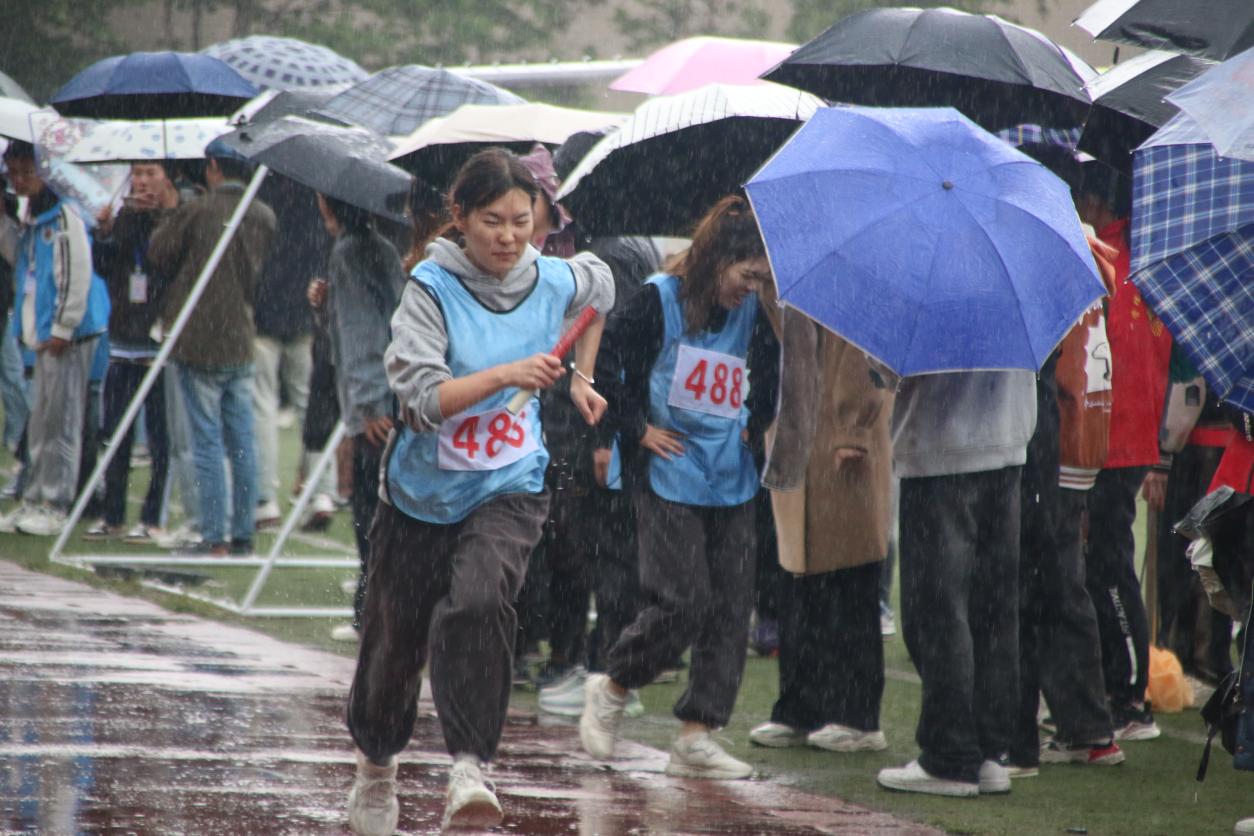 运动会期间气温骤降,细雨蒙蒙,运动员们的热情丝毫不减。径赛各队选手犹如离弦之箭冲出起跑线;田赛场上,跳远组、跳高组、铅球组的运动员们个个精神抖擞;趣味比赛轻松愉快,现场氛围紧张活跃,呼声高涨;裁判和青年志愿者们一丝不苟,用心地做好运动会的各项服务工作。