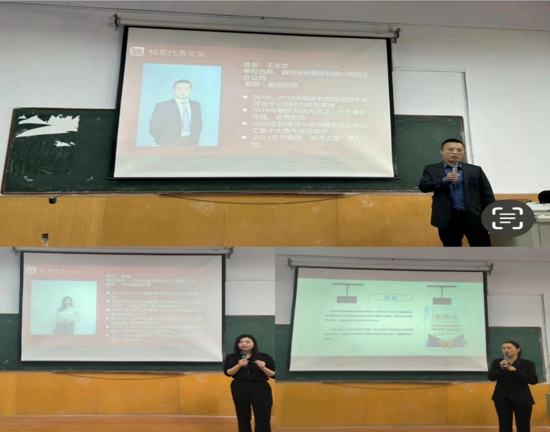 活动中廖俊峰致辞:感谢所有校友始终不离不弃,一直关注、关心、支持学院发展,感谢校友们重返校园,与同学们分享经验和心得;希望在校同学们做好规划、明确目标、综合发展。他表示学院致力于培养兼具家国情怀和先进视野的复合型会计人才。校友代表进行了经验分享,王志文分享了金融证券行业的任职现状和职位要求,并寄语会计系学子要积极面对挑战,创造更美好的未来。张晶就财务应用类知识进行分享,她建议同学们抓好基础专业知识、提高分析理解和总结归纳能力。不断挖掘会计内涵,未来面临新形势、有所新作为。罗帅琳针对 信息化发展时代的动向,建议同学们拓展思路,多学习,多思考。