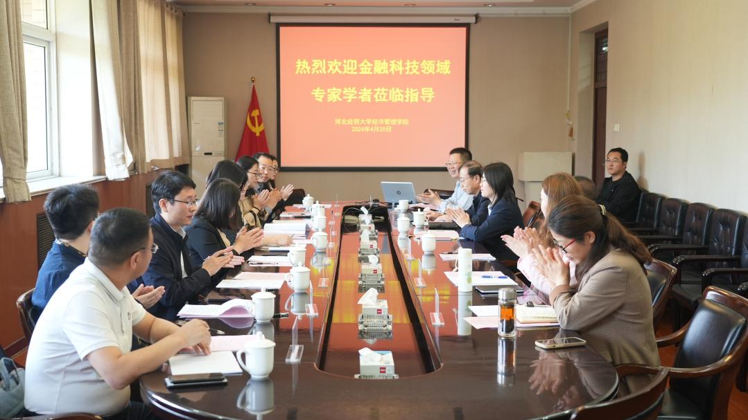 金融学院金融科技系主任曹衷阳教授;金融科技领域公司代表:北京知链科技有限公司新技术赋能教育研究院执行院长周博、北京知链科技有限公司华北区总经理王书斌、深圳典阅科技有限公司河北区总经理刘丹霞,还有行业代表恒银期货有限公司资深分析师张琼一。
