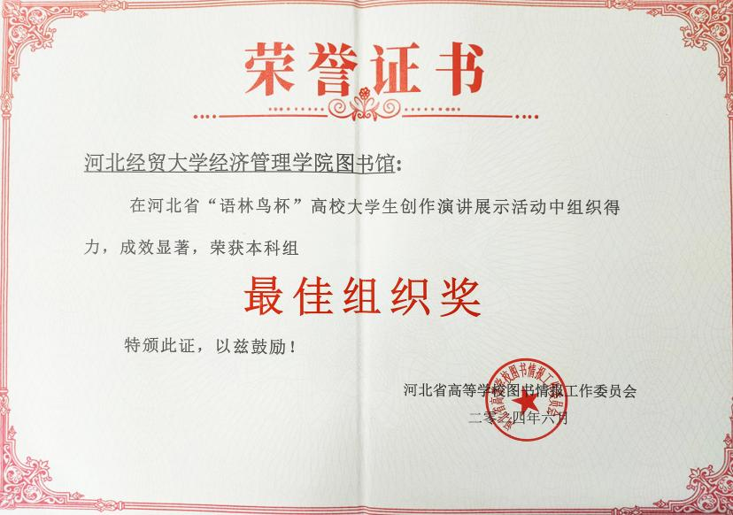 学生荣获本科组一等奖,学院图书馆获“最佳组织奖”荣誉称号。