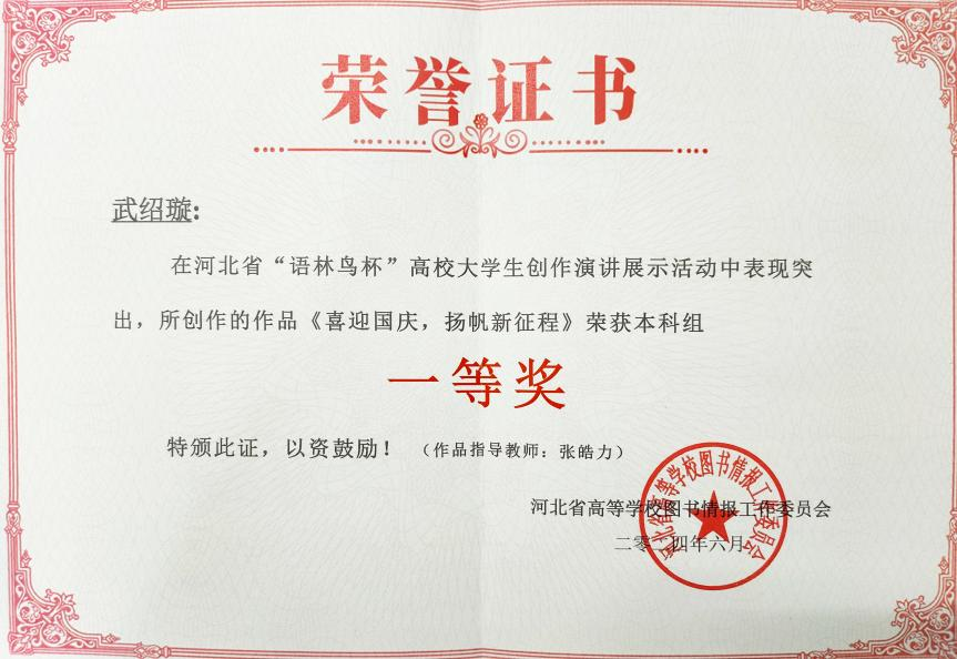图书馆积极组织师生参赛,最终经济系武绍璇同学凭借作品《喜迎国庆,扬帆新征程》脱颖而出,荣获“语林鸟杯”本科组一等奖,指导老师张皓力获得优秀指导老师奖,图书馆荣获本科组最佳组织奖。