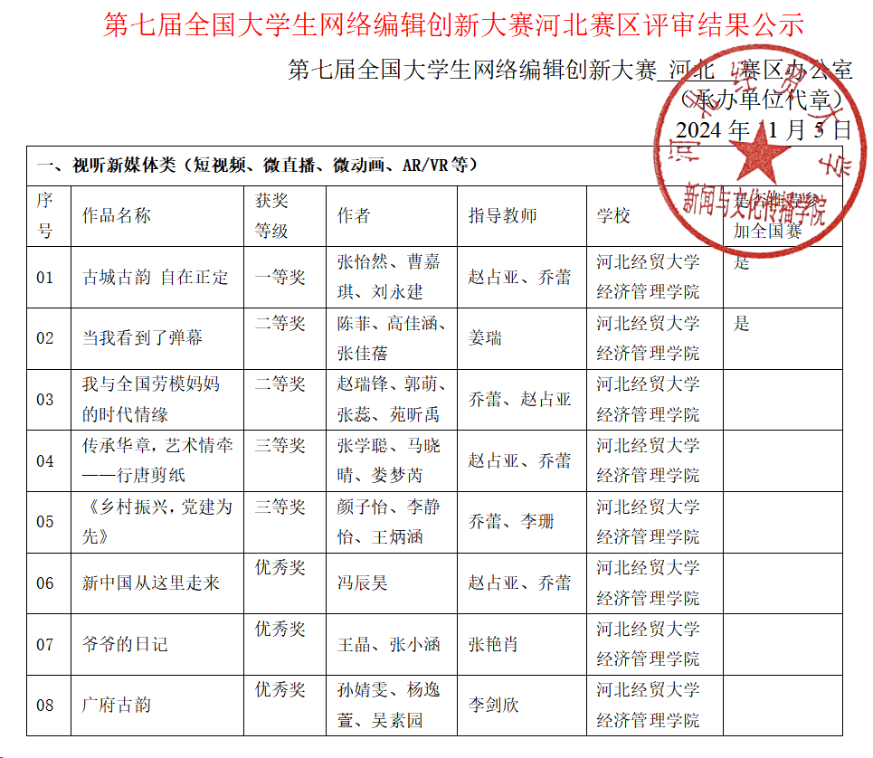 全国大学生网络编辑创新大赛由中国编辑学会主办,旨在展示我国大学生数字创意策划、网络内容编辑、新媒体运营和媒体新技术应用的成果,促进数字、文化与科技的融合创新及成果转化应用,已然成为我国重要的创新成果展示、交流、转化及创新人才甄选的平台。经专家评审,文法系推送的《古城古韵,自在正定》和《当我看到了弹幕》分别荣获视听新媒体类一等奖、二等奖并推荐参加国赛,《我与全国劳模妈妈的时代情缘》荣获二等奖,《传承华章,艺术情牵——行唐剪纸》和《乡村振兴,党建为先》荣获三等奖,《新中国从这里走来》、《爷爷的日记》和《广府古韵》荣获优秀奖。