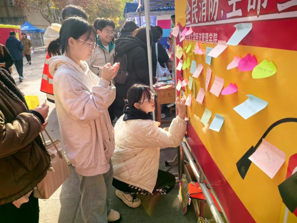此次活动以“全民消防、生命至上——学条例、用条例,落实消防安全责任”为主题,采取消防知识的宣传和身临其境的体验相结合的活动形式,活动现场,两位消防兵人偶为过往同学发放新修订的《河北省消防条例》和宣传单,消防安全员结合真实火灾案例向同学们讲解消防知识,现场还陈列了灭火器、消防水带等实物设备,供同学们亲手尝试体验,学院师生还在“消防留言板”上写下熟知的消防安全及反诈的标语。