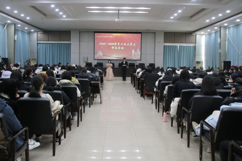 在图书馆报告厅开展2023-2024学年“十佳”优秀大学生评选活动。学院党委副书记刘佳出席,教务部、就业工作部、学生工作部负责人及各系副书记担任评委,百余名学生代表现场观摩了此次评选。