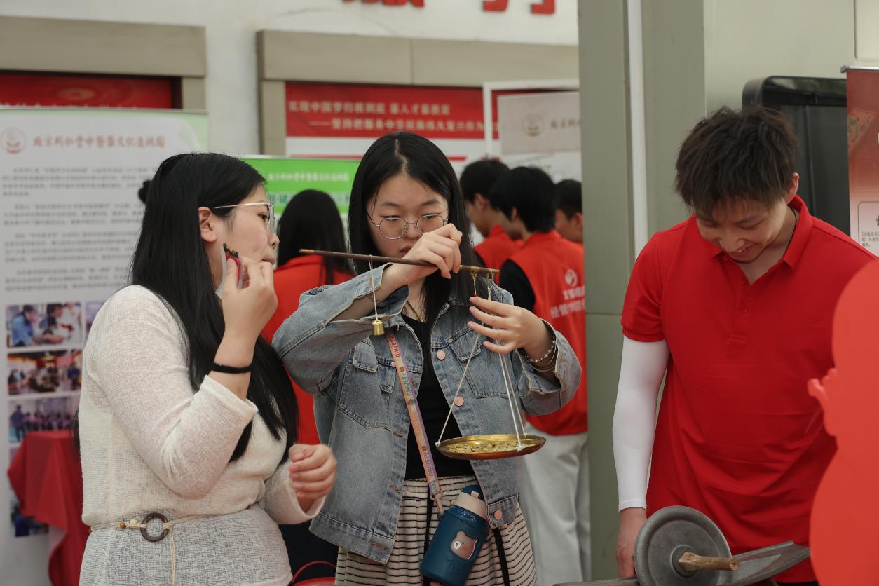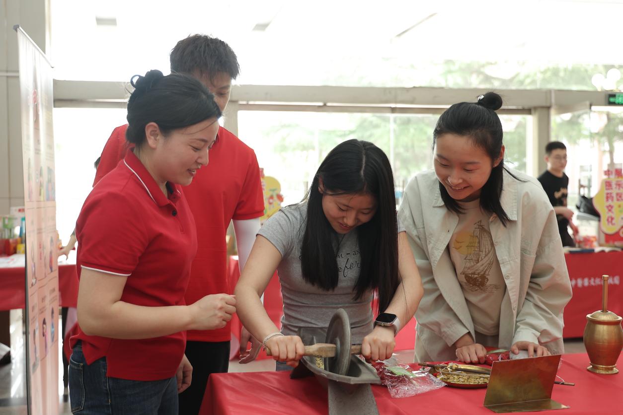 与此同时一楼大厅设置的沉浸式体验区也吸引了300余名师生的热情参与。活动巧妙地融合了中医药文化展示、传统制药技艺呈现、药食同源养生理念传播以及游戏互动体验等多种形式。工作人员耐心指导学生们现场体验称药、捣药、碾药、搓药等传统制药工艺,让大家深刻体会到制药工艺的精细与复杂;而妙趣横生的“看症状学配药”活动,则让学生们在游戏中轻松学习养生知识;AI 健康筛查仪更是成为现场的焦点,通过拍照、上传舌象图片,就能获取个性化的健康报告和调理方案,这项技术让学生们充分领略了中医技术的创新发展;此外,现场还精心准备了阿胶和养生代茶饮供师生们品尝,并设置了“打卡集章”赢取文创礼品的趣味环节。到场的师生们在亲身体验中,领略了中医药文化数千年的发展脉络,感受到了古法制药的非遗技艺之精妙。