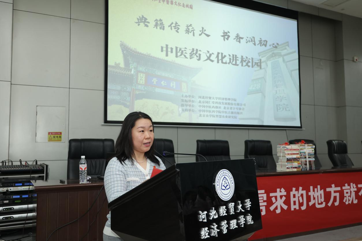 北京同仁堂科技发展股份有限公司营销党总支副书记陈萌在发言中对学院为同仁堂搭建的中医药文化展示平台表达了感谢之情,并期望未来能持续与青年学子携手,共同深入探索中医药文化在当代社会的价值,以实际行动传承和弘扬中华文明。