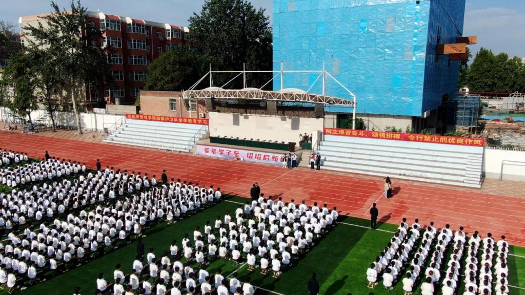 2025级新生军训动员大会在南校区操场隆重举行。院党委副书记刘佳、副院长王鸿喜,院办、团委、各系负责人、新生辅导员以及2025级全体新生共同参加大会。大会由学生工作部副部长秦志华主持。