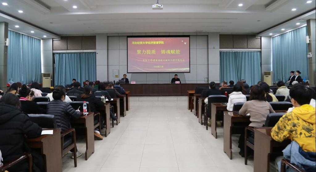 特邀中共河北省委党校教授、河北省"三三三"人才工程第二层次人选张宏升博士,作题为《深刻领会党的二十届四中全会精神 完整准确全面贯彻新发展理念》的专题讲座。学院党政班子成员、中层管理干部、各系专职组织员、党支部书记及委员、专职辅导员以及学生党员干部代表参加培训。
