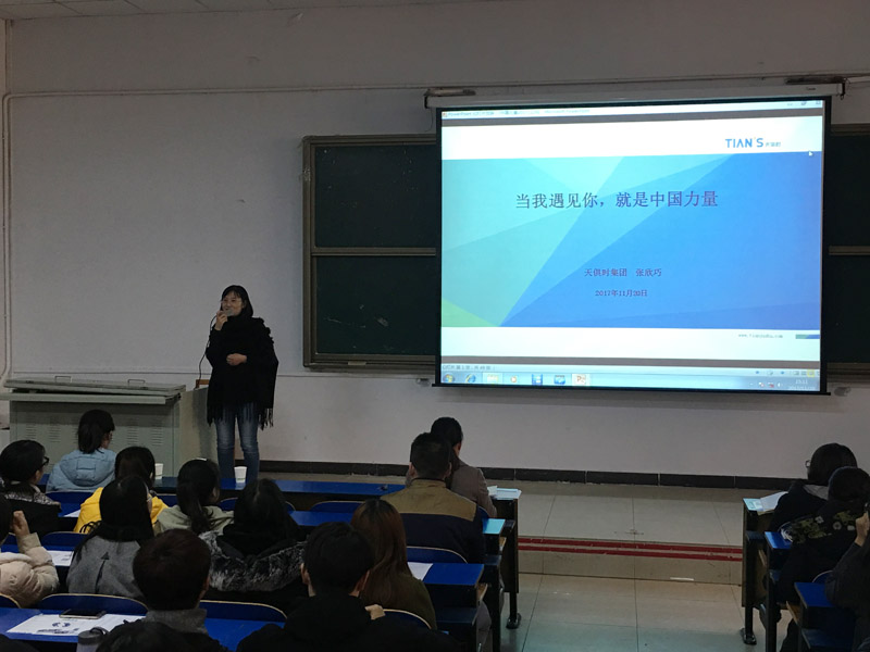 张欣巧总裁以“当我遇见你,就是中国力量”为题,从“自己的成长经历”、“集团的介绍”、“对同学们的寄语”三个方面展开了讲述。张欣巧总裁以她自己的工作经历和成长感悟,勉励同学们要努力学习,用知识来充实自己;又以天俱时集团人性化的经营模式不断学习地发展理念鼓励同学们,要树立终身学习的理念,增强就业意识,做好职业生涯规划,充分用好大学时光,把有限的时间投入到努力奋斗中去。