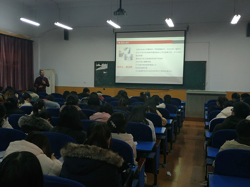 2019年12月23日下午,会计系在西院西阶梯教室举办成长有约之企业进校园活动。北京兴华会计师事务所河北分所副总经理袁占宾、动漫屋