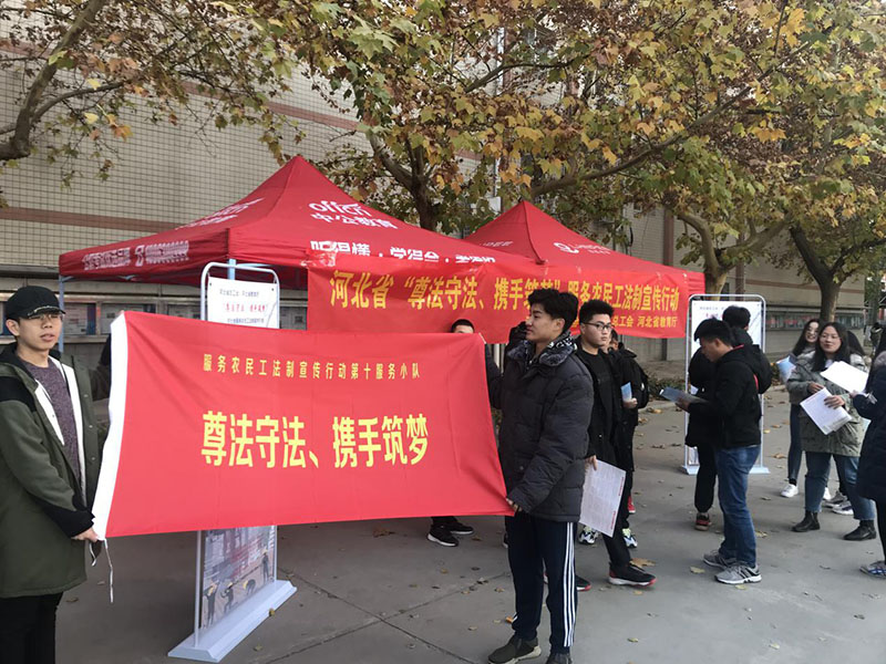 “尊法守法,携手筑梦”的法律宣传活动,以涉及农民工切身利益的劳动法律法规及政策知识宣传为主要内容,意在提高大学生身边农民工理解运用法律法规的能力。法学社同学深入宿舍宣传,让同学们深入了解农民工法律权益维护的相关问题,以便让同学们回到家中运用法律宣传所得和所学知识对家乡身边的农民工进行二次法制宣传,进而扩大宣传范围和效果。