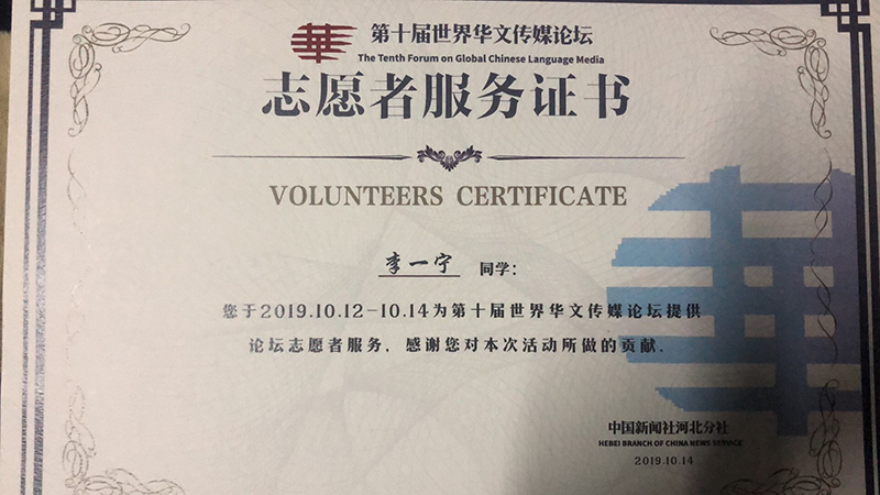 第十届世界华人传媒论坛由中央统战部(国务院侨办)、河北省人民政府、中国新闻社主办,有来自50多个国家和地区的400余家海外华文媒体领军人物,国家领导人及相关部委领导出席,是最具影响力的全球华文媒体国际性盛会。此次志愿服务活动的参与开拓了学生视野,培养了学生的新闻素养,更培养了学生的志愿服务精神,提高了学生的综合素质,展现了我系学子的精神风貌,增强了我系的社会美誉度。