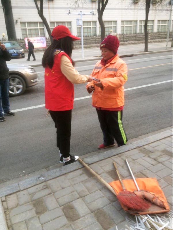 20名青年志愿者,沿着新石南路火车站方向徒步3公里,将60多份护手霜和手套送到保洁一线环卫工人手中,感谢他们长期顶风冒雪,坚守岗位,为扮靓“美丽石家庄”付出的辛劳。环卫工人收到礼物后,高兴地说:“小小礼物代表了志愿者的心,我们的工作能得到大家的理解和支持就心满意足了。”志愿者们纷纷表示,雷锋精神倡导的是爱岗敬业、无私奉献,环卫工人们始终如一默默工作,本身就是雷锋精神的体现,今天为这些城市美容师赠送爱心礼品,也希望通过绵薄之力表达对他们的敬意。活动结束后,志愿者与环卫工人合影留念。