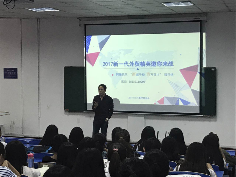 9月26日,阿里巴巴“百城千校百万英才”外贸人才高校巡回演讲会在北校区院第二教学楼105教室举行。阿里巴巴衡水站总经理王朝军、优秀员工代表张磊、孙佳做主旨宣讲,商务系书记廖俊峰出席,国贸、电商专业共计150名大四学生聆听了讲座。