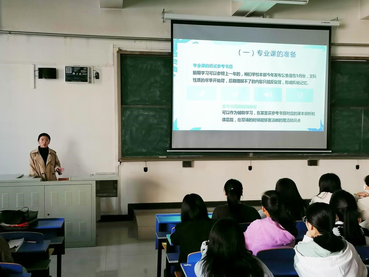 研究生的学长学姐,分享他们考研的体会与成功经验。分享会由2019级辅导员郑廷主持,200余名有考研意向的学生参加。
