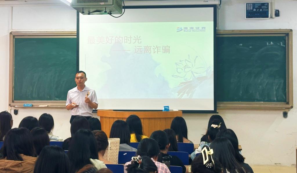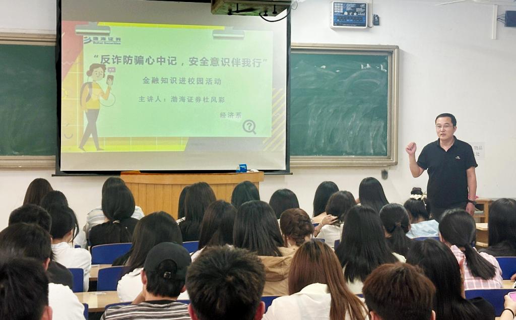 渤海证券股份有限公司石家庄裕华证券营业部营销副总杨健向同学们普及了有关金融行业现状及校园网络安全防范知识,提高了同学们的安全防范意识。参加此次活动的同学表示:“通过活动不仅掌握了防诈骗的知识,加强了自我安全意识,还学习到了如何将反诈知识运用到实践中去,帮助自己和身边人提高安全防范意识。