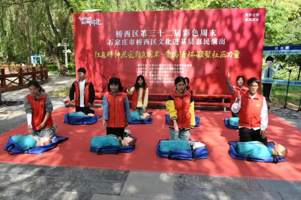 表演结束后,大学生志愿者还为社区居民详细介绍了心肺复苏步骤及海姆立克急救法技巧,并邀请居民上台实践。