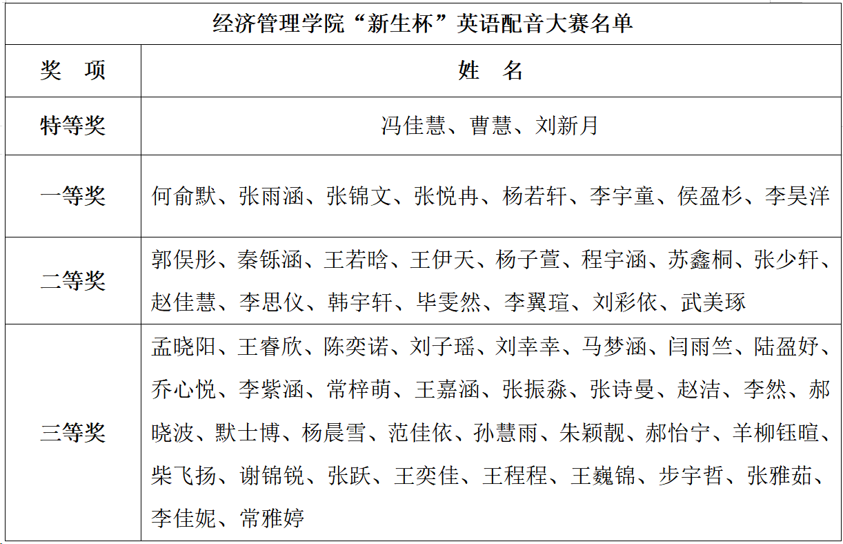 获得省赛一等奖的作品《新中国从这里走来》供参赛选手进行英语配音。大赛提供中英文文稿和英语配音版及消音版短视频。参赛选手在熟悉材料的基础上通过剪映、PR等软件为短视频配音。大赛得到了2025级新生的积极响应和热情参与,共收到短视频配音作品76部。经过层层筛选,冯佳慧等3名同学获特等奖,何俞默等8名同学获一等奖,郭俣彤等15名同学获二等奖,孟晓阳等34名同学获三等奖。