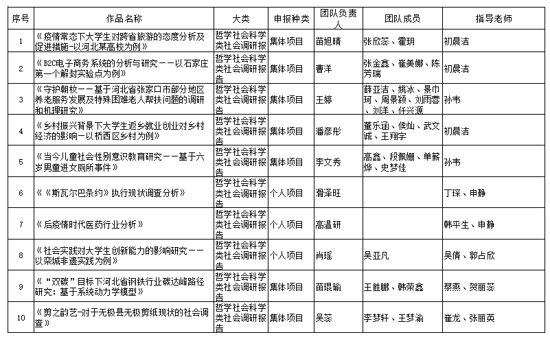 根据《关于组织开展2023年“挑战杯”河北省大学生课外学术科技作品竞赛的通知》等相关文件要求,经团队申报、单位推荐、专家评审等环节,最终评选出参加省赛项目20个,现将名单公示如下。