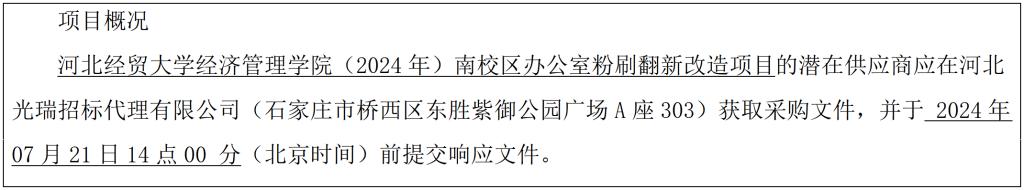 投标文件递交的截止时间(投标截止时间,下同)为 2024年07月21日14点00 分(北京时间) ,地点为河北光瑞招标代理有限公司(石家庄市桥西区东胜紫御公园广场A座303)。
