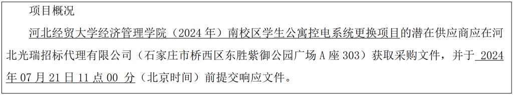 投标文件递交的截止时间(投标截止时间,下同)为 2024年07月21日11点00分(北京时间) ,地点为河北光瑞招标代理有限公司(石家庄市桥西区东胜紫御公园广场A座303)。