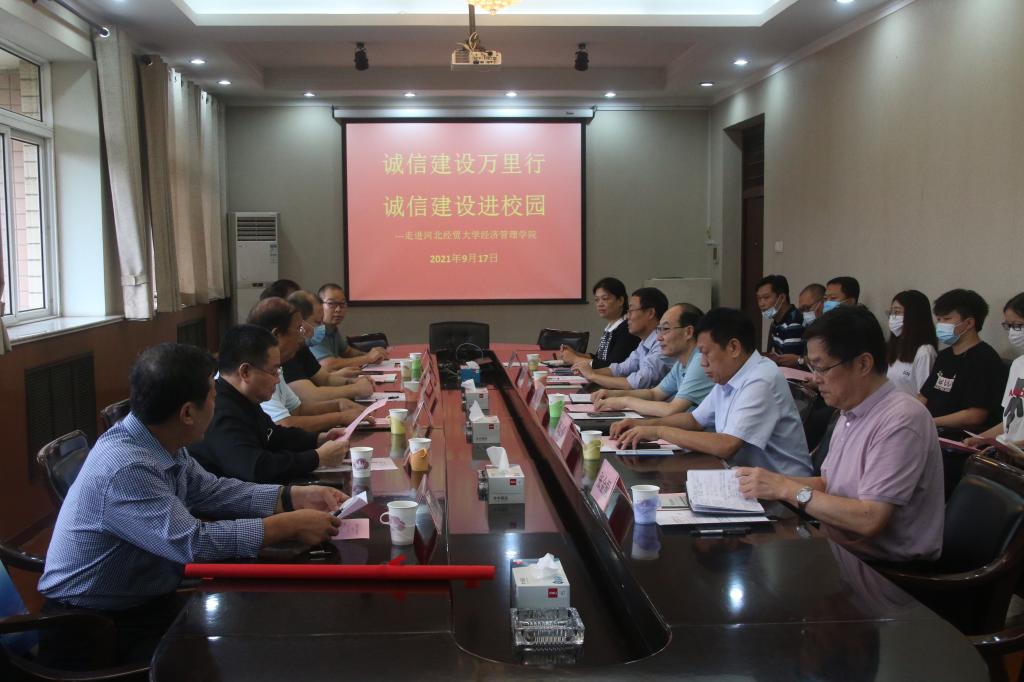 授予河北省信用协会常务副会长单位牌匾。随后双方就“如何有效开展诚信建设进校园工作”进行了座谈。座谈会由省信用协会执行秘书长、省消保委原秘书长张福齐主持。学院办公室、宣传部、学生工作部负责人以及十余名学生代表参加座谈。
