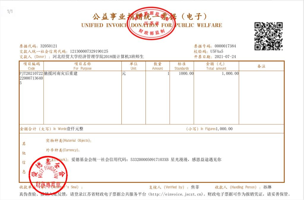 得到系里和学院领导支持后,任栢林代表该班,将900元班级奖励金和100元老师捐款一起汇到了腾讯公益爱德基金会,为帮助河南顺利渡过灾情贡献一份力量。