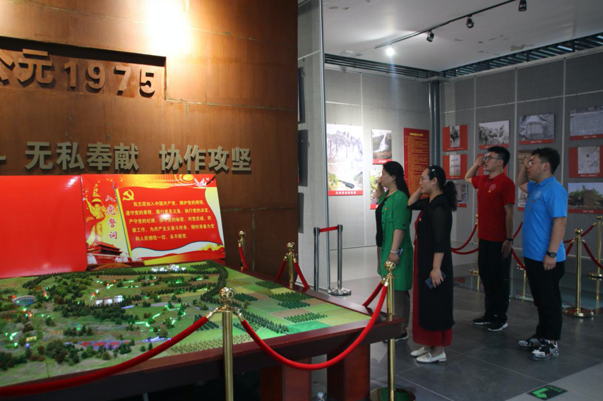 实践小分队刚刚下大巴,便看见一条宽广的水渠由山上奔涌而下,“千峰百嶂跨险要,一跃冲向万里涛”,正是跃峰渠的真实写照。而跃峰渠纪念馆正跨立于跃峰渠水流之上,渠水流淌而过,仿佛在不断冲刷着历史的尘埃,谱写着太行儿女荡涤人心的奋斗之歌。进入纪念馆,“战天斗地、艰苦奋斗、无私奉献、协作攻坚”的跃峰渠精神印刻在似悬崖峭壁般的深棕色墙壁上,院党委副书记张丽英带领小分队师生党员,伫立于党旗前,重温入党誓词。