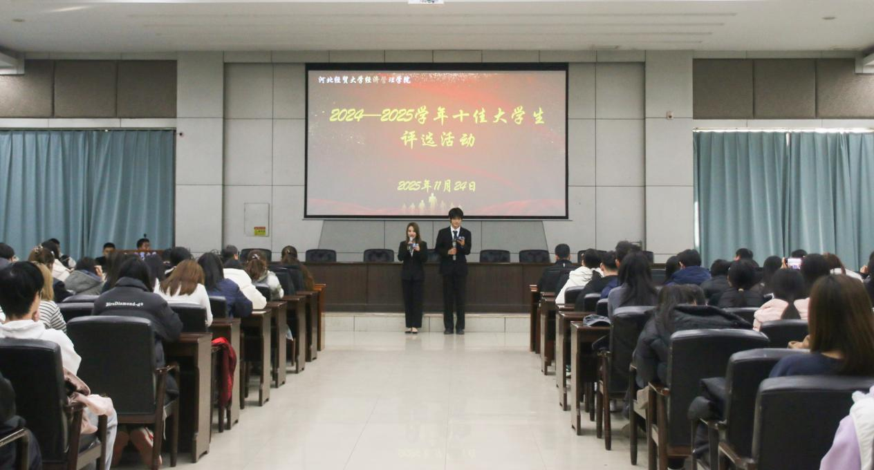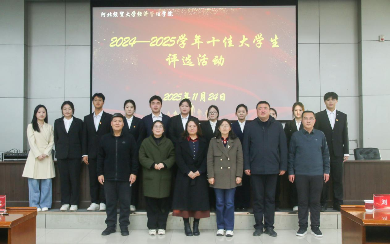 经评委公正评审,商务系智欣茹、杨泽琨,文法系张怡然,管理系王双喆颉、许极、王涵,会计系赵梓君,经济系张佳萌、李帅,信息系孙卓昊十位同学荣获本学年“十佳”优秀大学生称号。