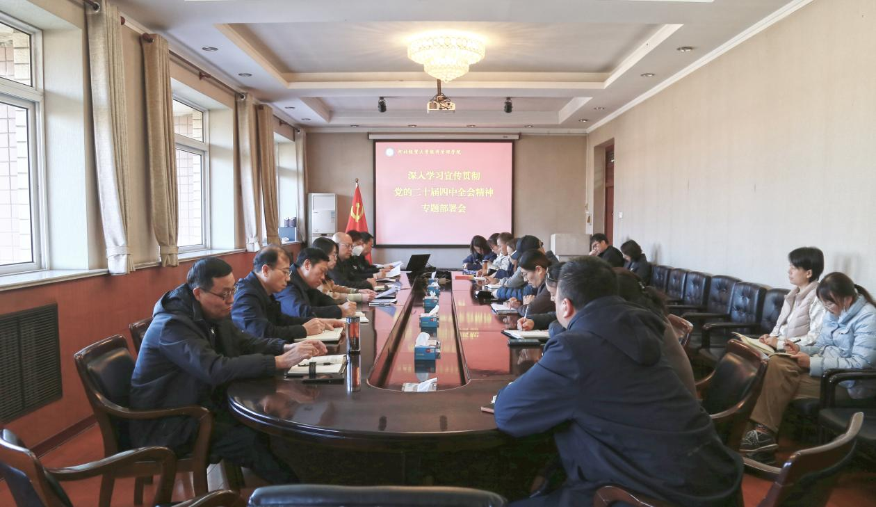 11月18日,学院召开深入学习宣传贯彻党的二十届四中全会精神专题部署会,就全面贯彻落实全会精神、党中央决策部署以及学院党委工作要求进行动员和安排。学院党政领导班子成员、各系部教研室(中心)负责人参加了会议。部署会由院党委书记蔡杨主持。
